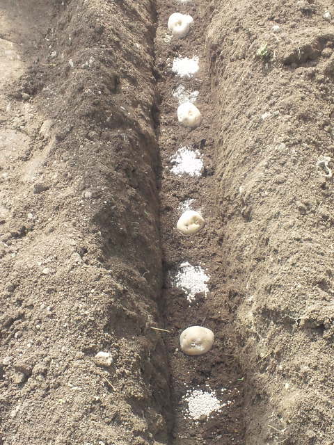 並べ終わったら、種芋と種芋の間には、種芋に触れないように肥料を置いて行きます。