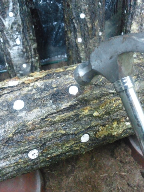 で、金鎚で、ホダ木の椎茸菌が打ち込まれた場所を、軽く叩いて行きます。