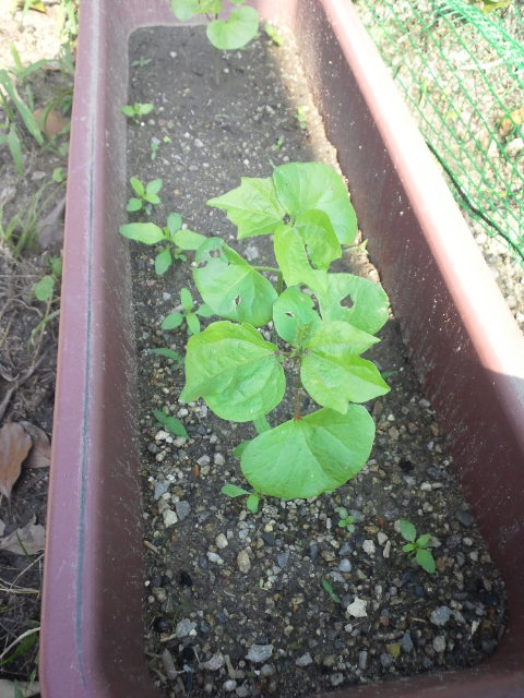 土止めのプランターに息子が植えたコスモスと綿花は順調に成長しています。