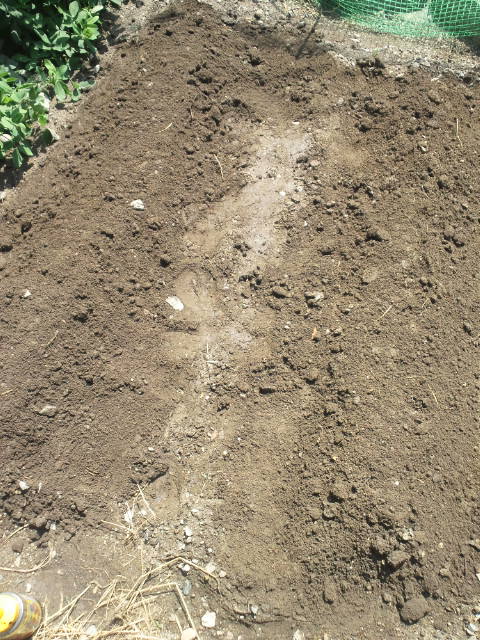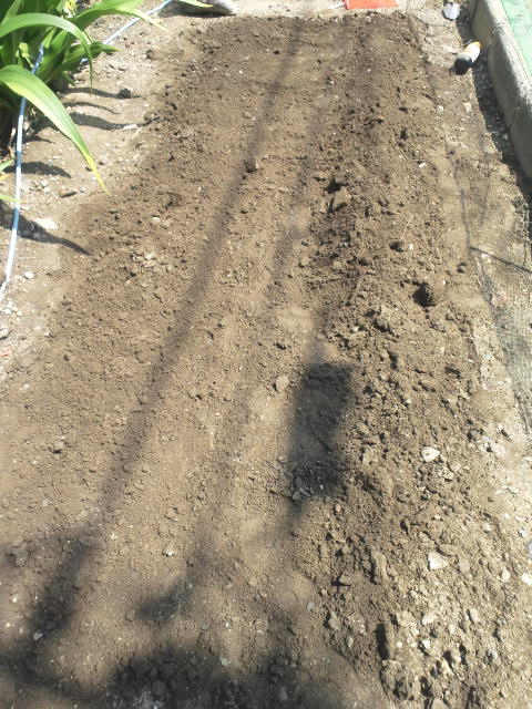 石灰や堆肥を鍬込んでおいた場所に、深さ15cm位の植え溝を掘ります