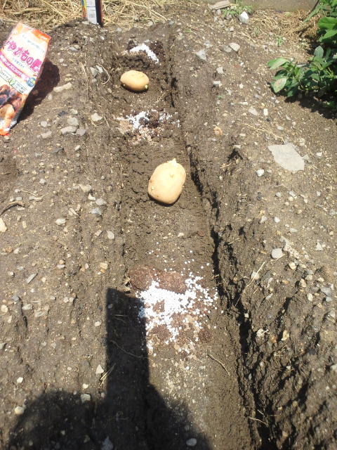 同じように溝を掘って、種イモ8個と置き肥を置いていきます。