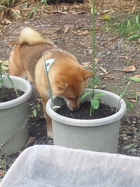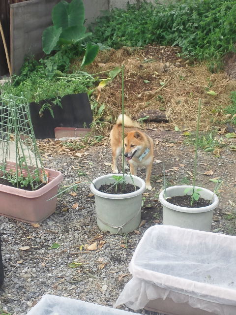 秋採りキュウリを植え付けると、早速やって来た柴犬さくら。