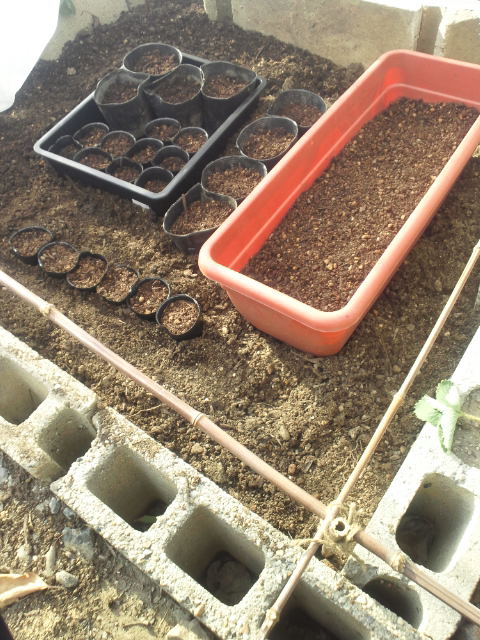 葉牡丹と白菜、サニーレタス、地這いキュウリのポットを作り苗床に設置。