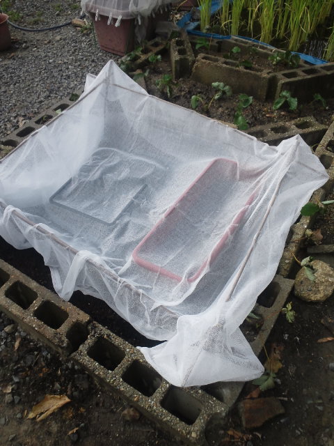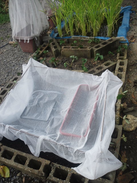種蒔き後には、水をたっぷりあげてネットをかけました。