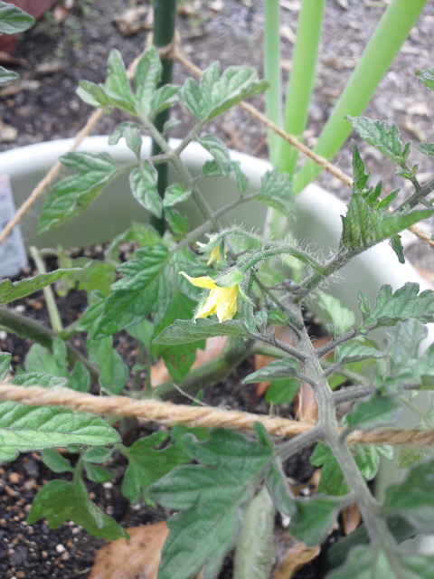 花芽の着き始めた夏野菜達のなかで、トマトが黄色い一番花を咲かせました♪