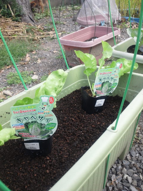大きめの野菜プランターに、キャベサイの苗2つを植え付けます。