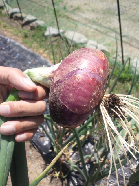 普通の玉ねぎに続いて、赤玉ねぎも収穫時期を迎えました!