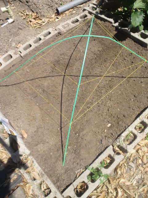 植え付けた後は、柴犬さくらに踏み荒らされないようにガード(笑)