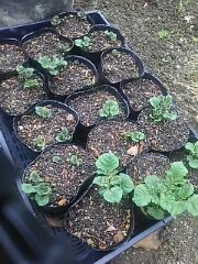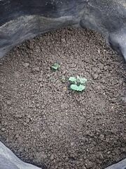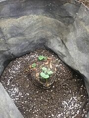 昨年から始めた、不織布ポットに1/3くらい土を入れて、真ん中に馬鈴薯の苗を配置。