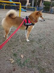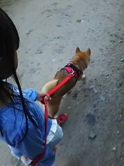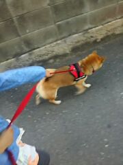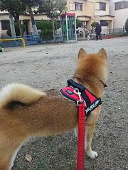 まだ、1人でリードは危険なので、パパが持ってるリードを持って練習中。