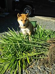生姜の葉の上に、どっかと座った柴犬さくら。