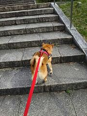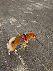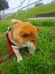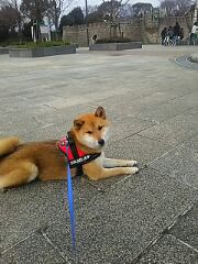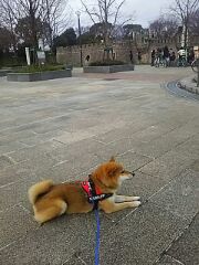 シャボン玉を終え、なみの広場を後にした柴犬さくら