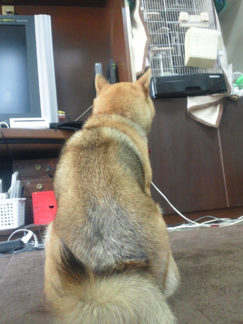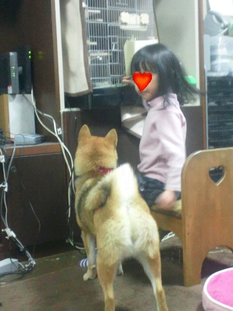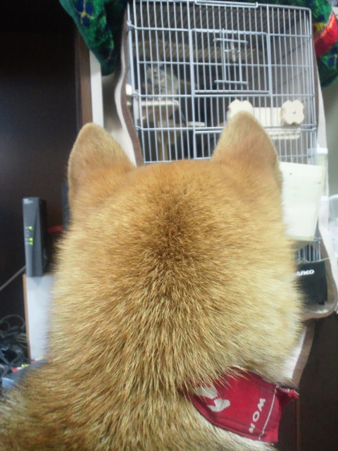 もみじ君をがん見するさくらちゃんの背中がかわいいです。