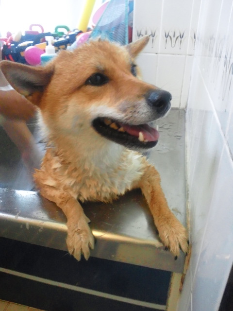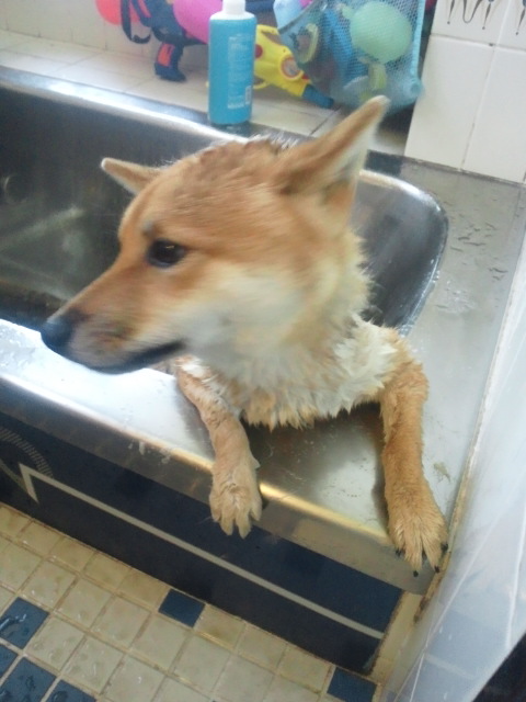 洗われてお疲れ気味な柴犬さくらに