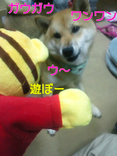 人気のしまじろうのマペットで、退屈魔神の柴犬さくらと遊びました。