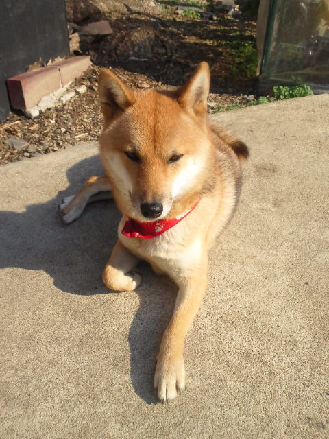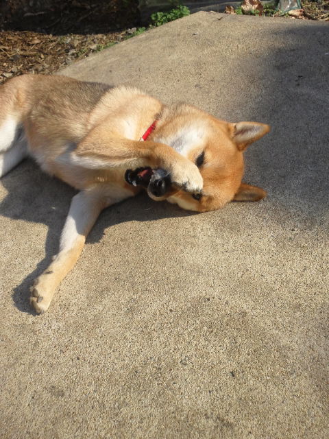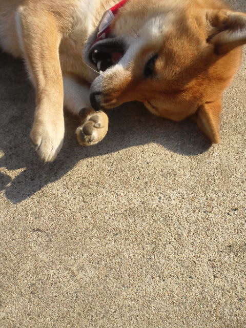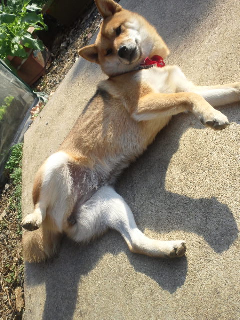 いつものように、陽向ぼっこしながら、悶えてる柴犬さくら。