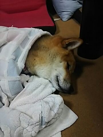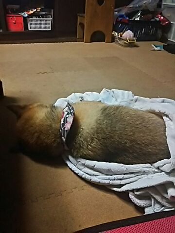 タオルケットの上に寝てたので、グルグルにされてました(笑)