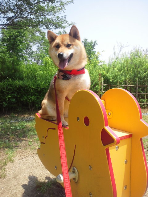 って事で、ひよこ?さんの遊具に乗せられた柴犬さくら。