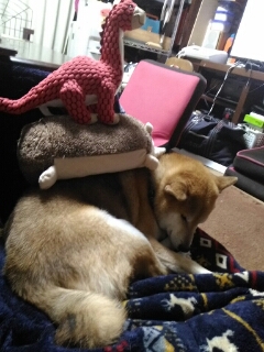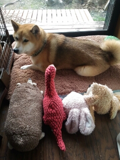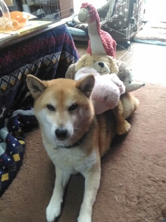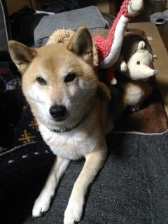 クリスマスからこちら、何故かヌイグルミが増えた柴犬さくら。