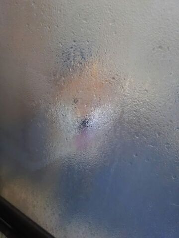 曇ったガラスの向こうに、ボ~ッと浮かび上がる柴犬らしき姿。