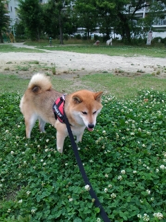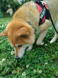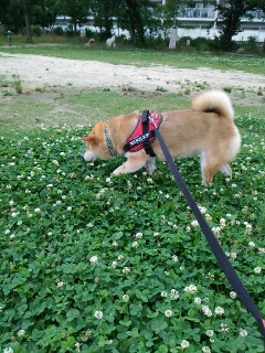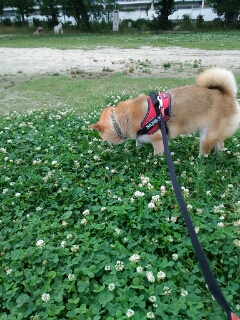 濡れてるシロツメクサとお戯れの柴犬さくら。