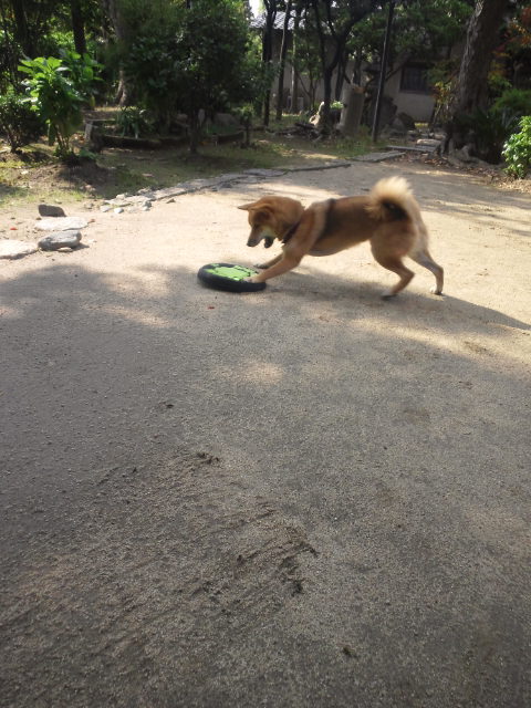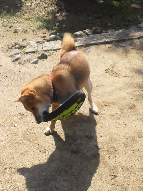 落ちたソフトフリスビーをくわえて振り回してる所…