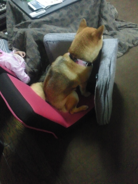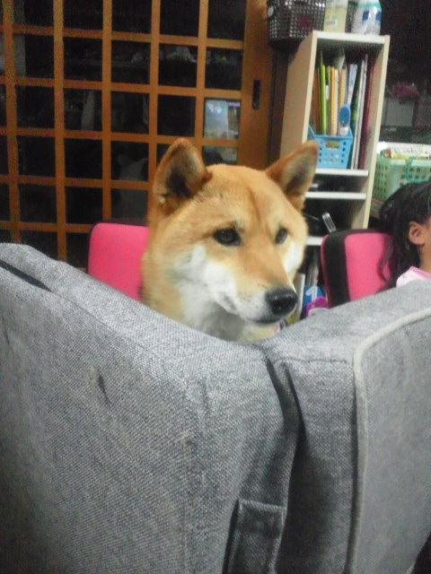 座椅子が邪魔だけど、出れないけど、テレビが気になる真剣な表情に笑えるでしょ。