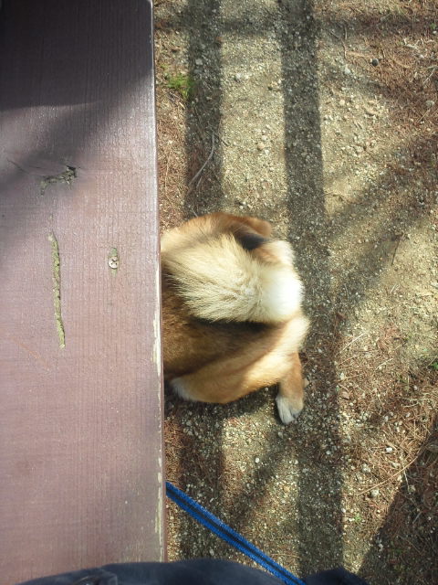 待ちくたびれた柴犬さくらは、暑いのかベンチの下へ入り込んで、休んでました。