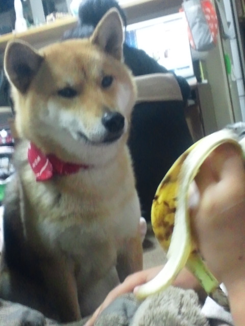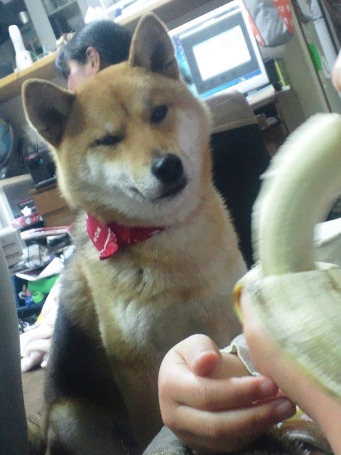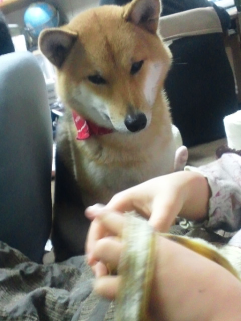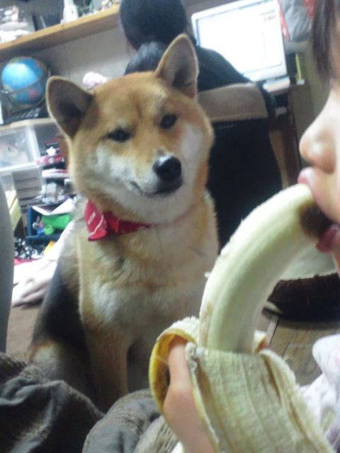 バナナが欲しくて、熱い視線を送る柴犬さくら。