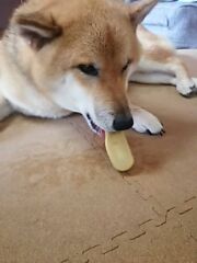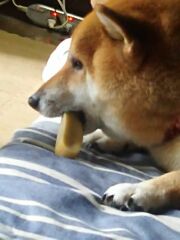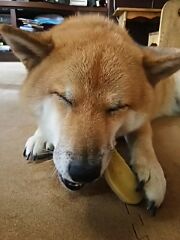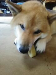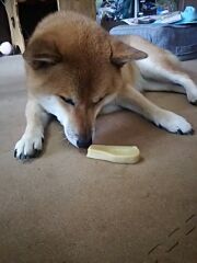 やっと、少し大きめの破片にありついた柴犬さくら