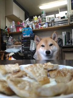 ママが焼いてくれた豚肉が冷めるのを待ってます。