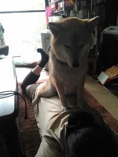 うちは、朝起きたら、私のお腹の上で、意味もなく仁王立ちで立っているということが何度かあります。もちろん、あの柴犬です。