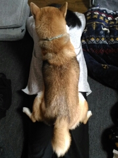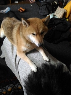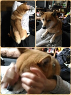 ならばと、仰向けに寝転がるママのお腹に柴犬さん。