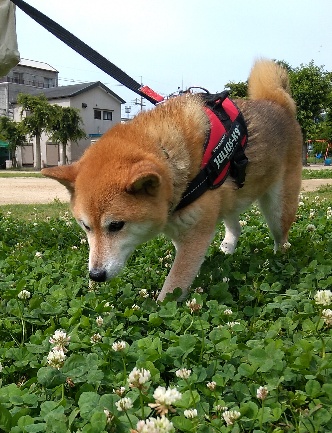 シロツメクサが沢山咲いていて、柴犬さんは楽しそうにスンスン。