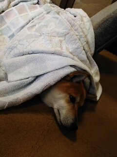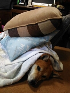 お掃除中のさくらちゃん、上からクッション、クッション、布、柴犬のぬいぐるみのようになっていますね(笑)