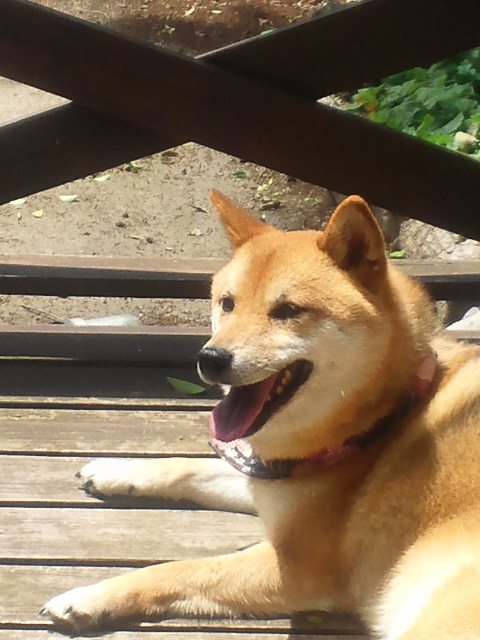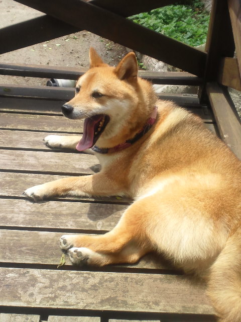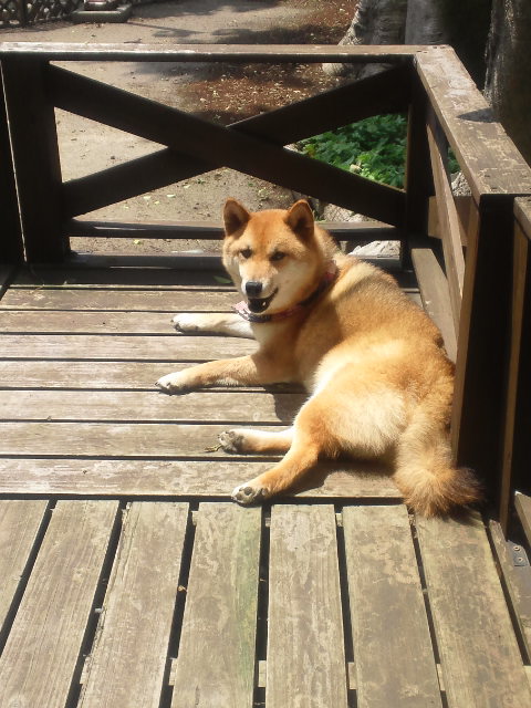 ウッドデッキでくつろいでる柴犬さくら。