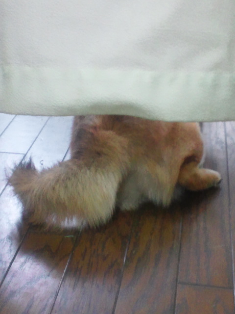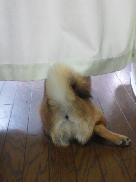 風で膨らんだカーテンで、頭隠して尻隠さずな柴犬さくら。