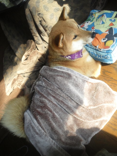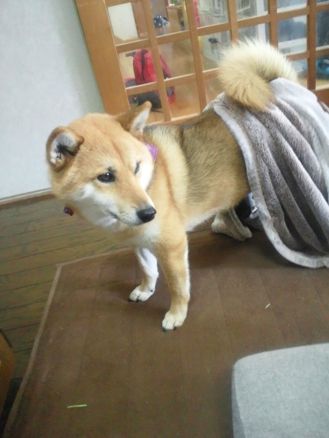 寝込んでるすきに、毛布を掛けられた柴犬さくら