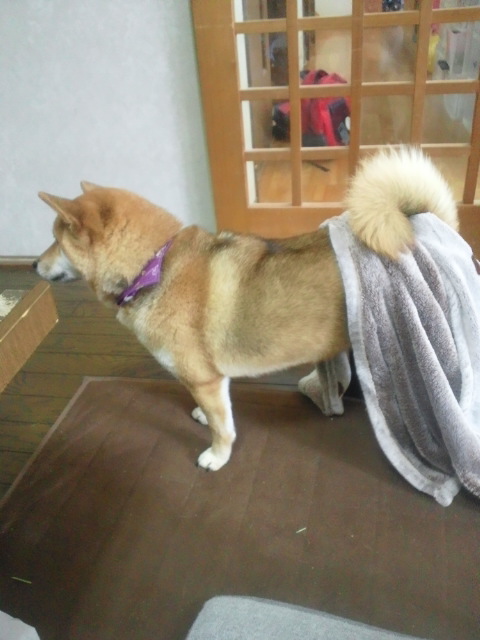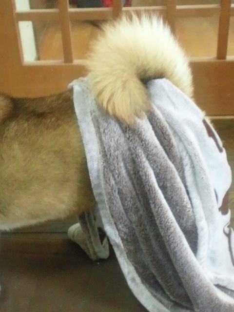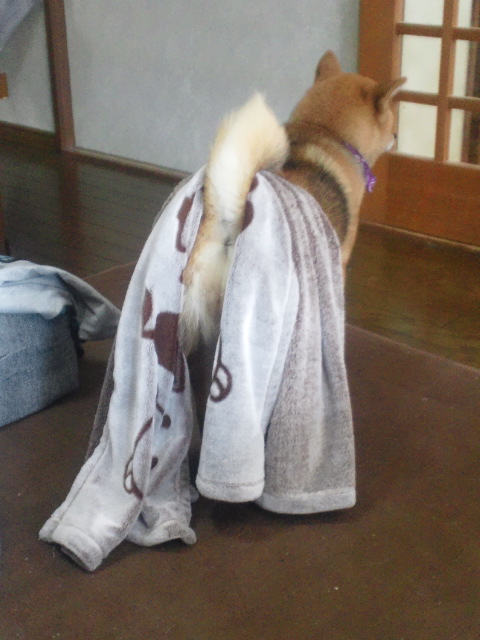 うふふっ、クルリン尻尾に引っかかった毛布。