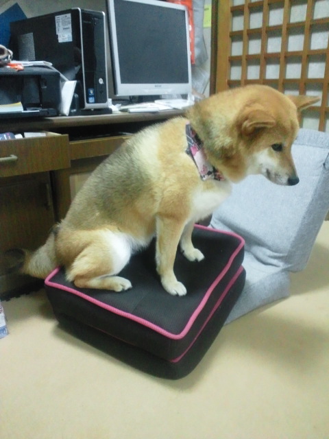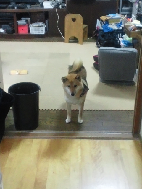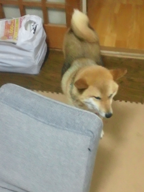 座椅子の後ろで、コソコソしている柴犬さくら。