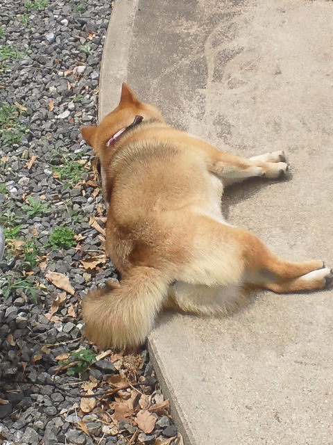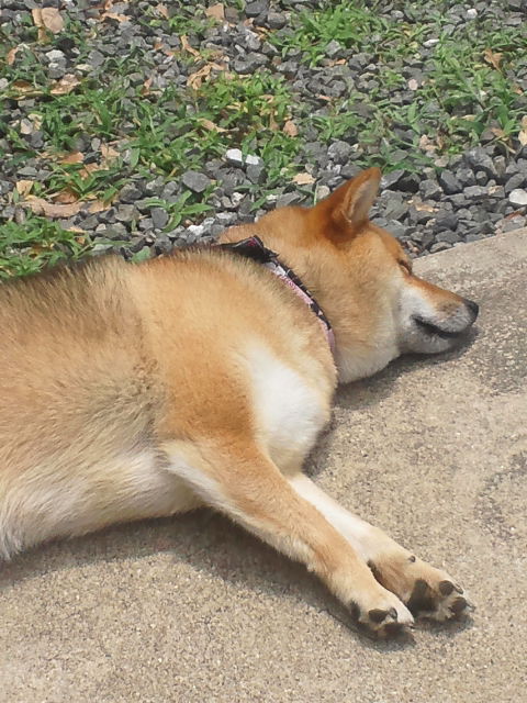 何で、こんなに暑いのに…って思うんだけど、熱くなったコンクリートの上で、日光消毒する柴犬さん、家にも4頭いますよ(笑)我が家では「毛皮の虫干し」って言ってます。隣の家のお子さんに「あっ、犬が死んでる!」って大声で言われたことがあります。4頭も一度に死んでたら大事件ですけど…でもそのくらい爆睡してるんですよね。そのあと、家に入ってきて「フーッ」って溜息ついてるのが可笑しいです。