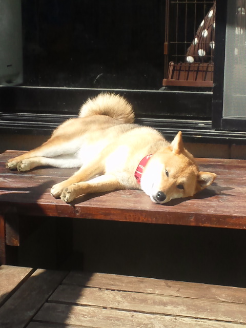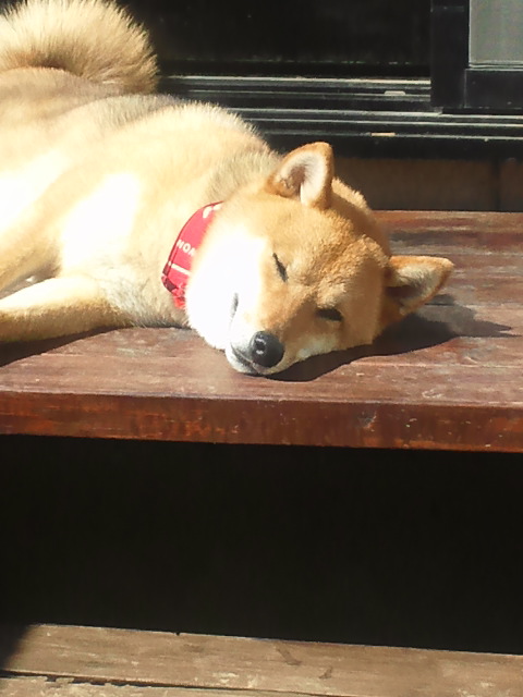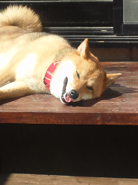 縁側で寝ているさくらちゃん、気持ち良さそうですね。この季節の日差しってポカポカと暖かくて気持ちいいのでしょうね。
