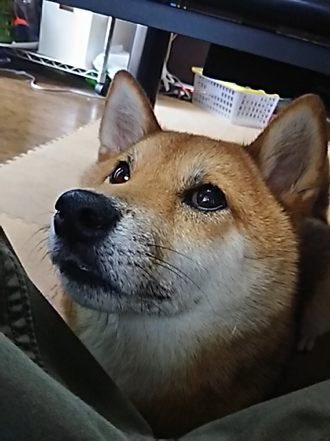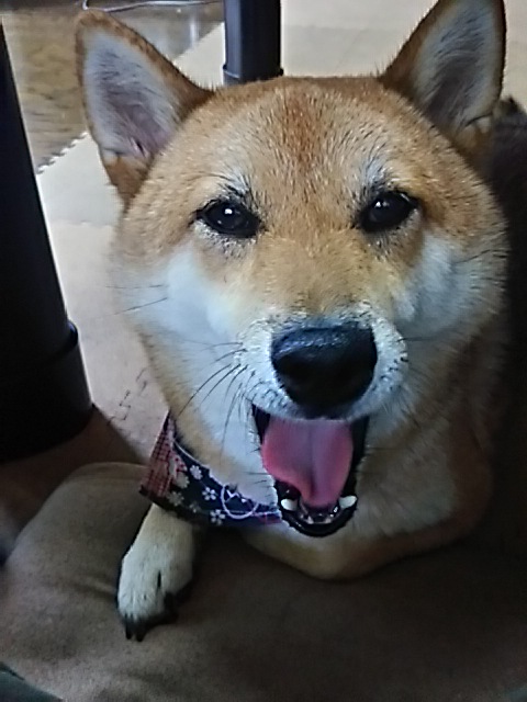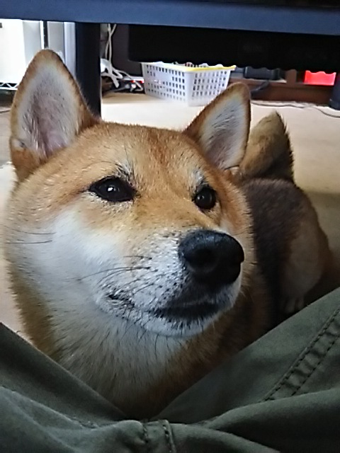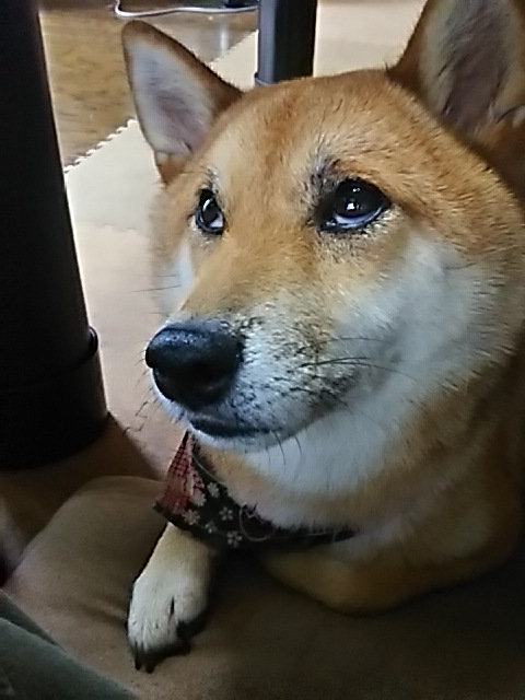 テーブルの下から顔を出して、熱い視線を送る柴犬さくら。