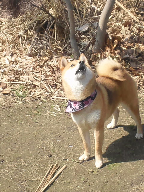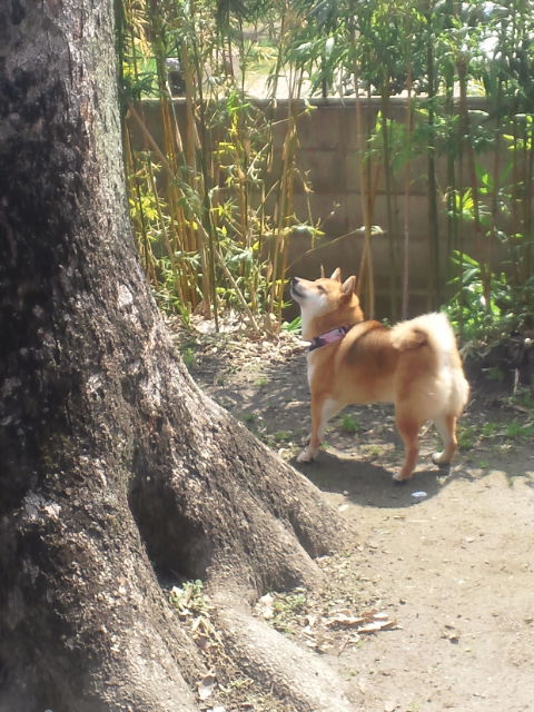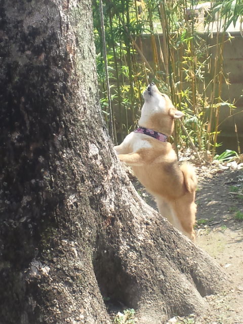木に登れない柴犬さくらは、下でガウガウしながら、周りをクルクル