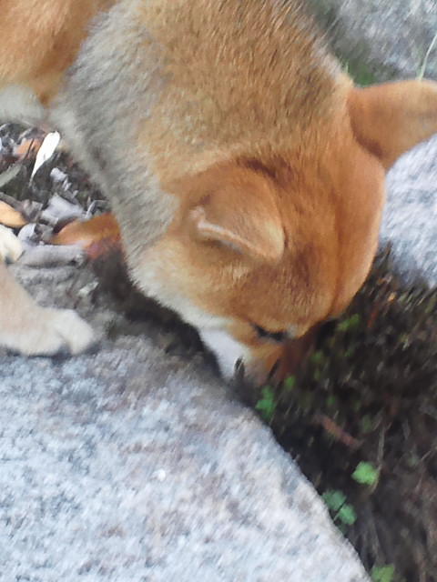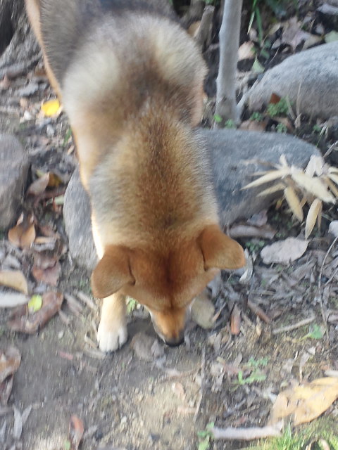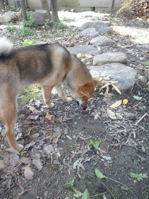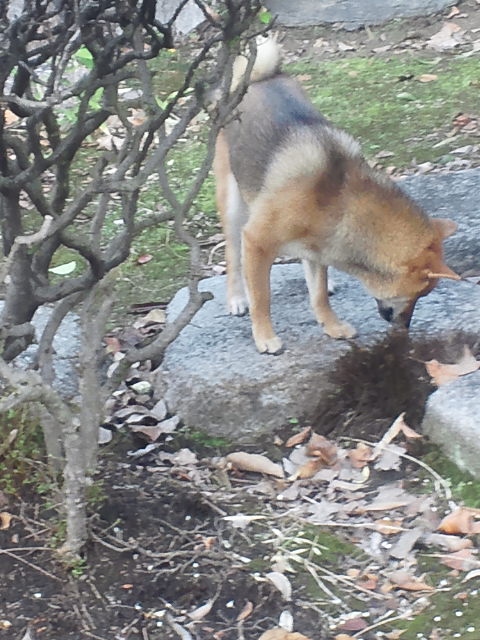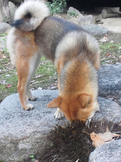 首を振り振り、苔を撒き散らしてた柴犬さくら。