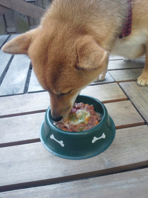 いつもなら、顔を見て指示を待つ柴犬さくらですが、フードボールから目を離しません(笑)