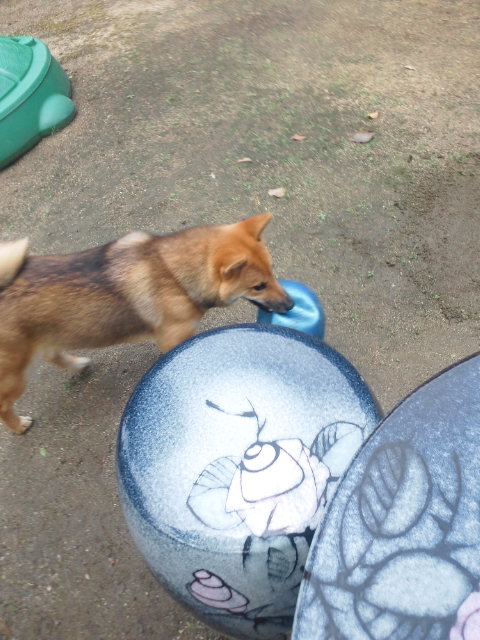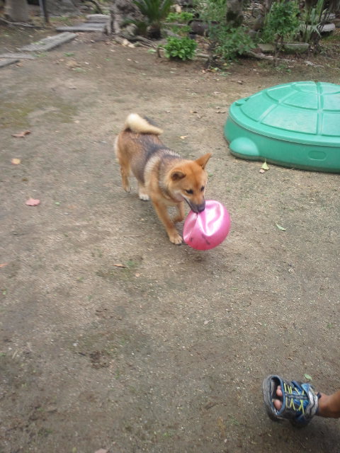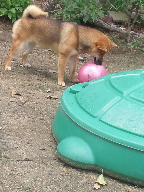 久しぶりに青いボールを見つけた柴犬さくら。