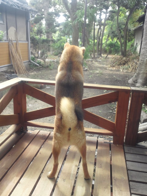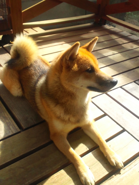 グリーンカーテンが無くなったウッドデッキにたたずむ?柴犬さくら。