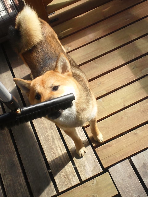 ウッドデッキの上でブラシした後、毛を掃いてると、必ず喧嘩を仕掛ける柴犬さくら。