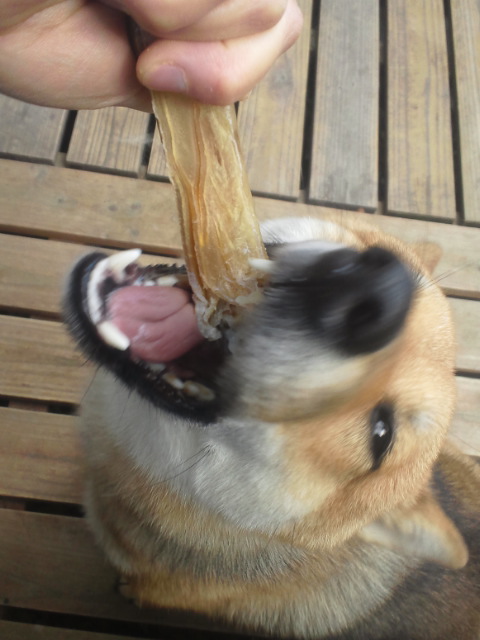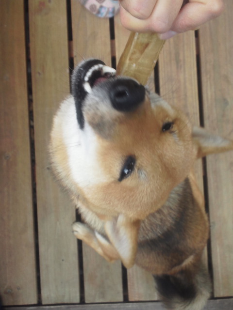 最近、ブラッシングの時には、うしのかわで作った犬ガムがもらえる柴犬さくら。